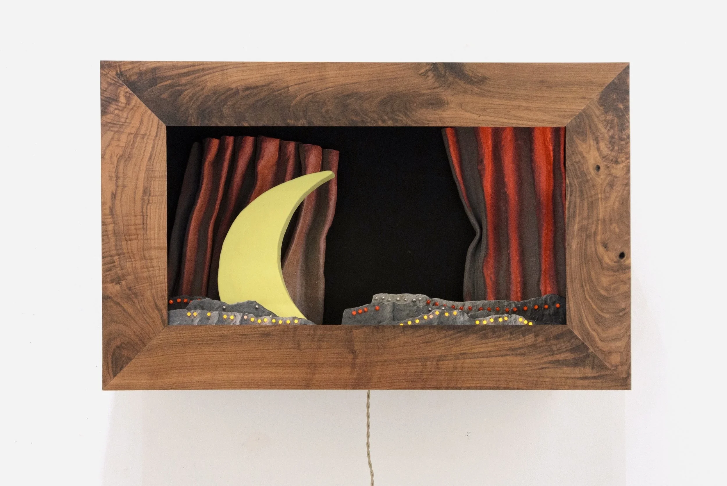 Desert. MDF, walnut veneer, ceramic, velvet, found plastic, electrical components. 2025. Photo credit: Lindsey Kennedy
